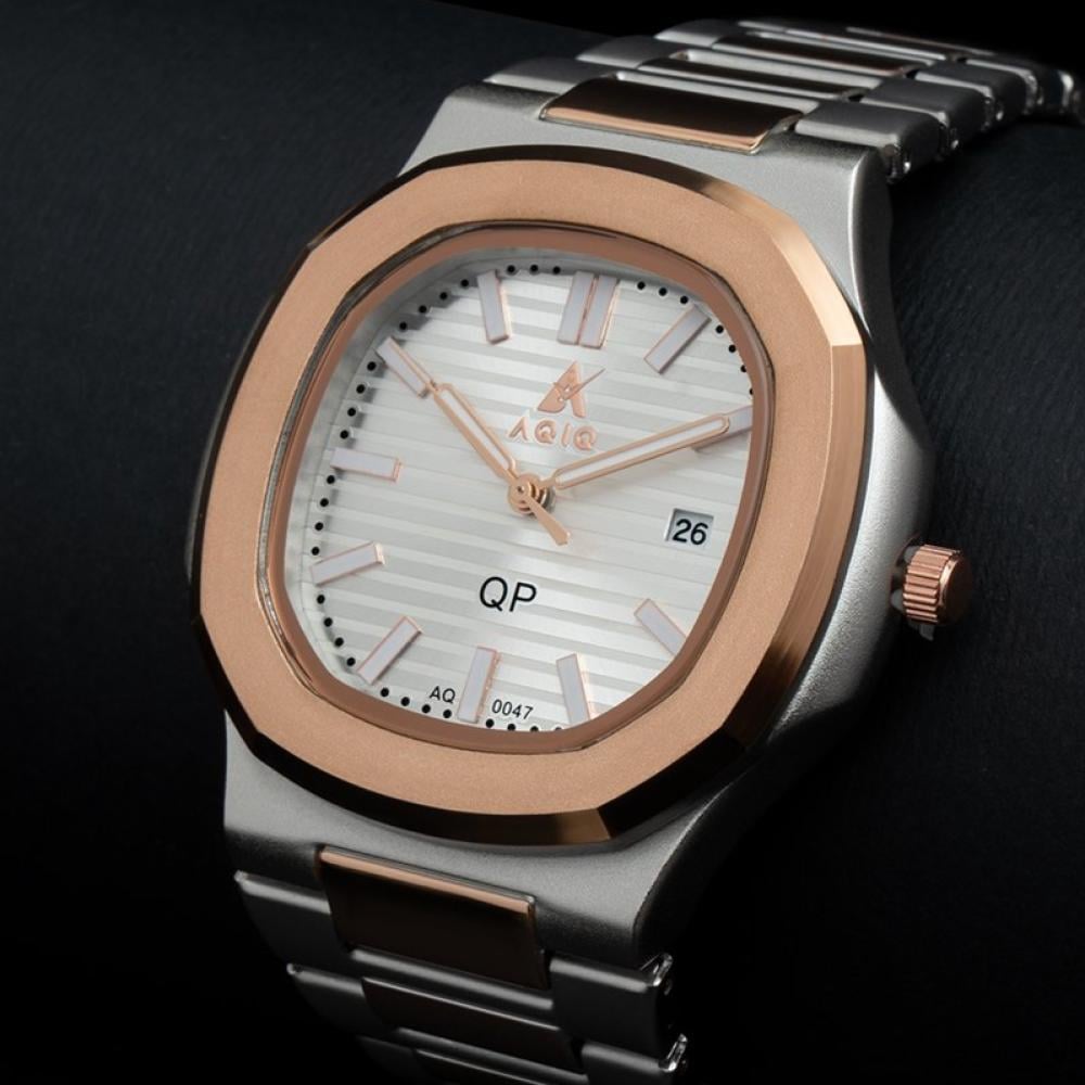 - ساعه رجالية بسير ستانلس استيل بل لون الفضي مطعم ب لون روز قولد .
