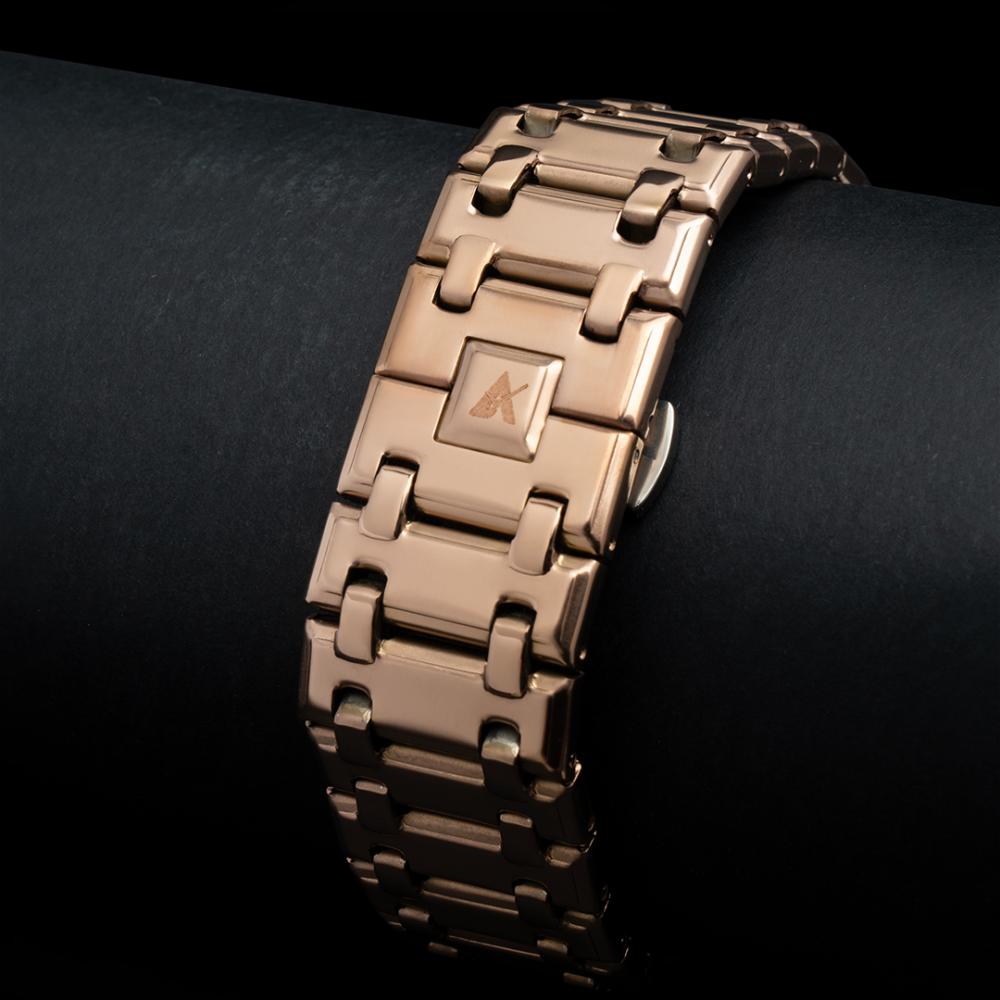 ارتقِ بأسلوبك مع ساعة عقيق الرجالية QA، حيث يجتمع التصميم الراقي مع الأداء العملي لمنحك ساعة تجمع بين الأناقة والجودة العالية. تأتي هذه الساعة بسير مصنوع من الستانلس ستيل المتين باللون الروز قولد، ما يجعلها خيارًا مثاليًا للرجل العصري الذي يبحث عن لمسة من الفخامة.